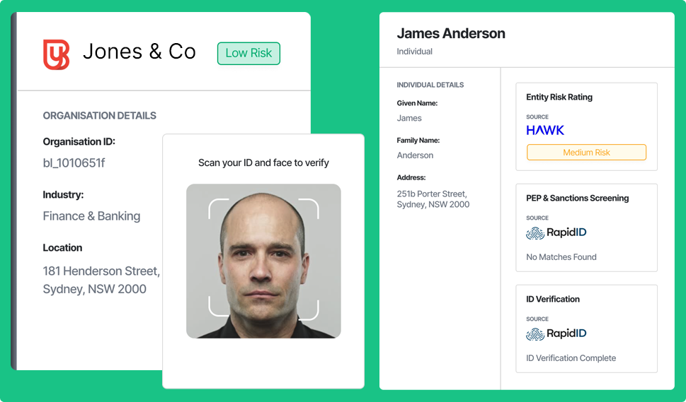 AML/CTF-regulated businesses are required to verify the identity of prospective customers before doing business with them. That means confirming identity against government sources, screening for PEPs and sanctions and making sure the person is who they say they are. On top of that, many businesses need to collect their own onboarding data through forms specific to their product or service.
