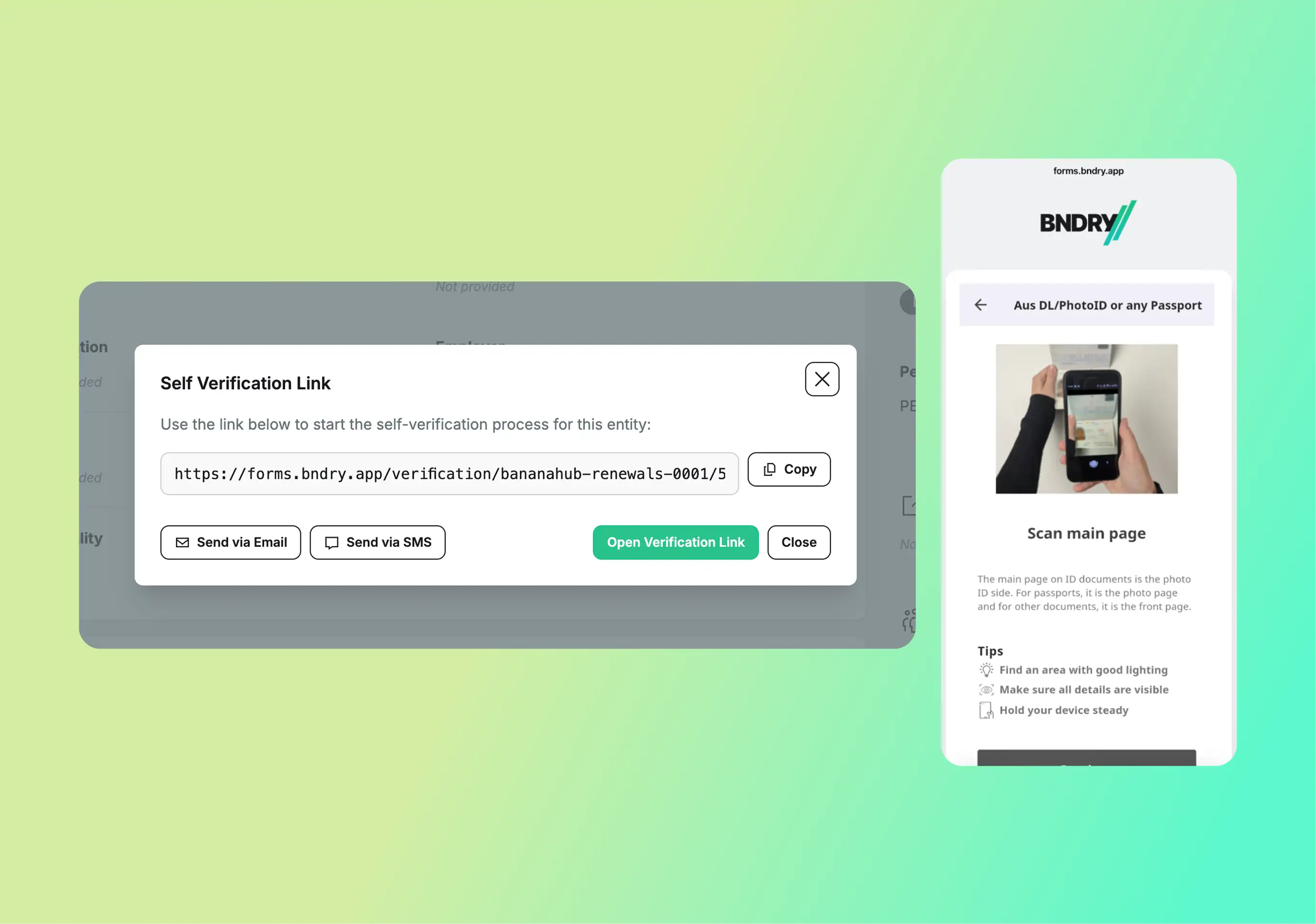 Whenever you need a customer to verify their identity, you can now generate a self-verification link directly from that customer’s entity profile. Once you share this link to your customer, they’ll be guided through a journey scanning their documents, checking liveness and biometrics. The details and results of the check will be logged against the entity in BNDRY. You can also trigger this flow via API, and embed BNDRY’s self-verification experience directly into your application.