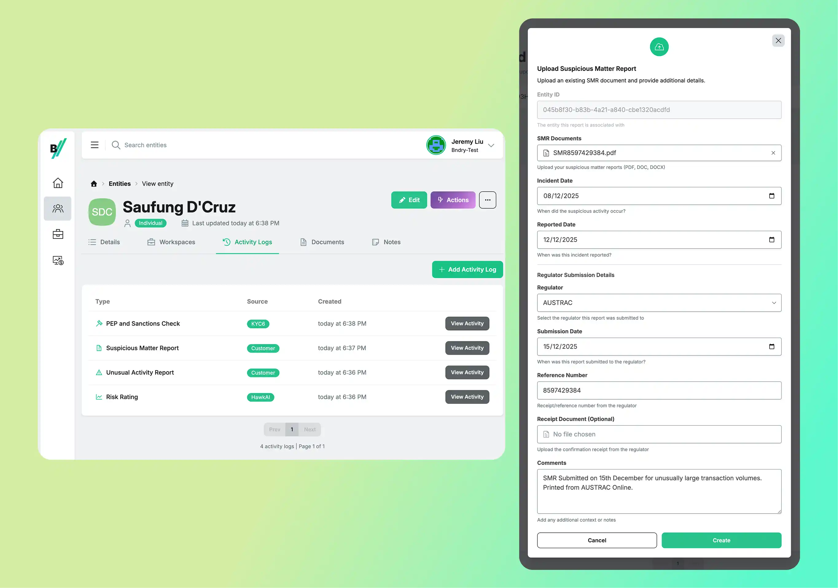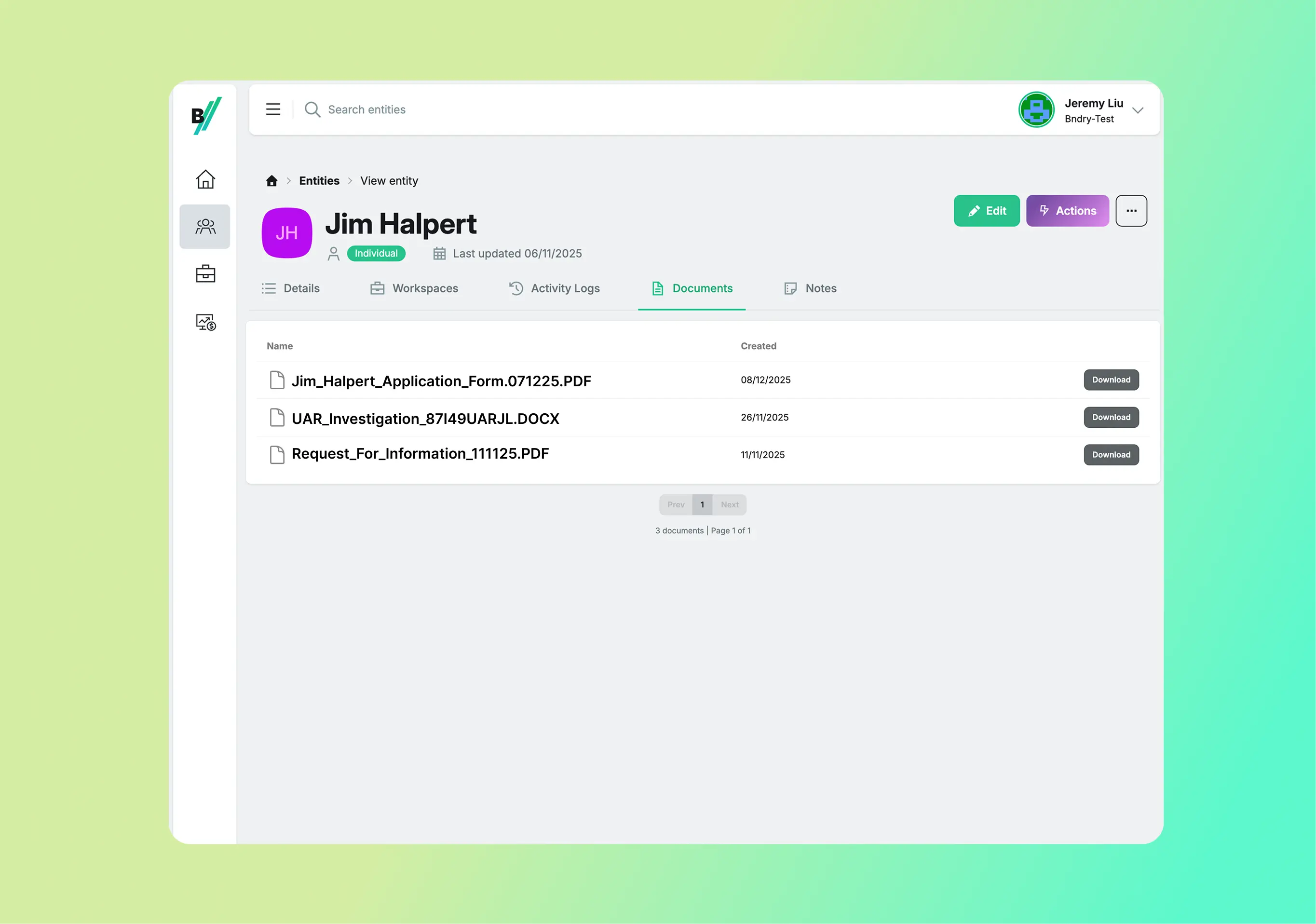A universal pain point amongst compliance teams is wrangling together evidence and documentation about an entity, particularly if they all relate to different processes whether it be investigations, ongoing due diligence, information requests, and more. Users have told us it’s not uncommon for it to take days or even weeks to collate the information required for periodic reviews or regulator audits. Against every entity in BNDRY is a documents tab. The documents tab aggregates all the documents attached to any activities logged against the entity. Stop searching all your folders and enjoy the visibility of all compliance documentation and files you have for a customer, in one place.